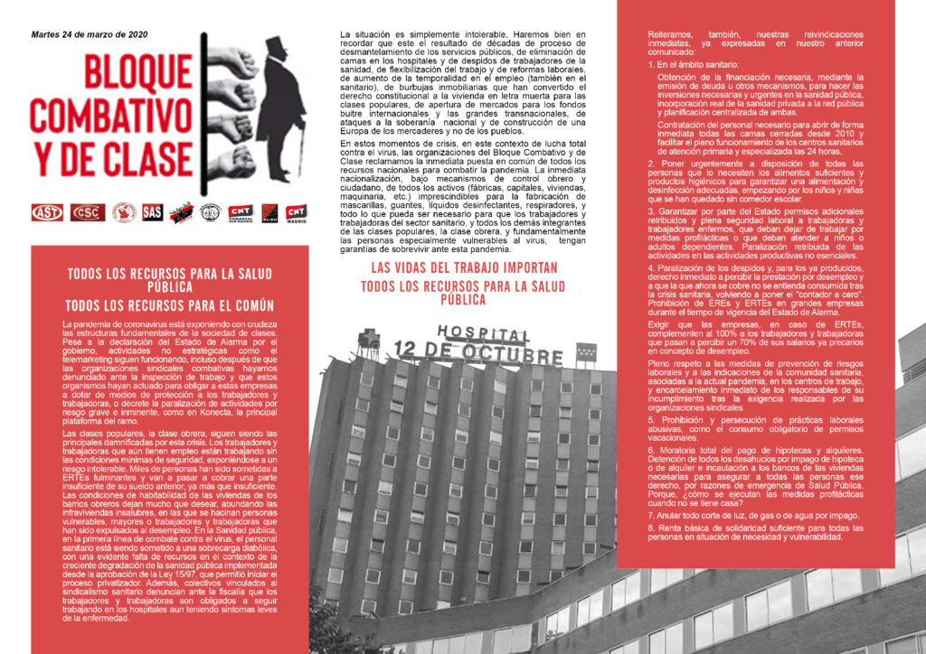 En estos momentos de crisis, en este contexto de lucha total contra el virus, las organizaciones del Bloque Combativo y de Clase reclamamos la inmediata puesta en común de todos los recursos nacionales para combatir la pandemia. La inmediata nacionalización, bajo mecanismos de control obrero y ciudadano, de todos los activos (fábricas, capitales, viviendas, maquinaria, etc) imprescindibles para la fabricación de mascarillas, guantes, líquidos desinfectantes, respiradores, y todo lo que pueda ser necesario para que los trabajadores y trabajadoras del sector sanitario, y todos los demás integrantes de las clases populares, la clase obrera, y fundamentalmente las personas especialmente vulnerables al virus, tengan garantías de sobrevivir ante esta pandemia.