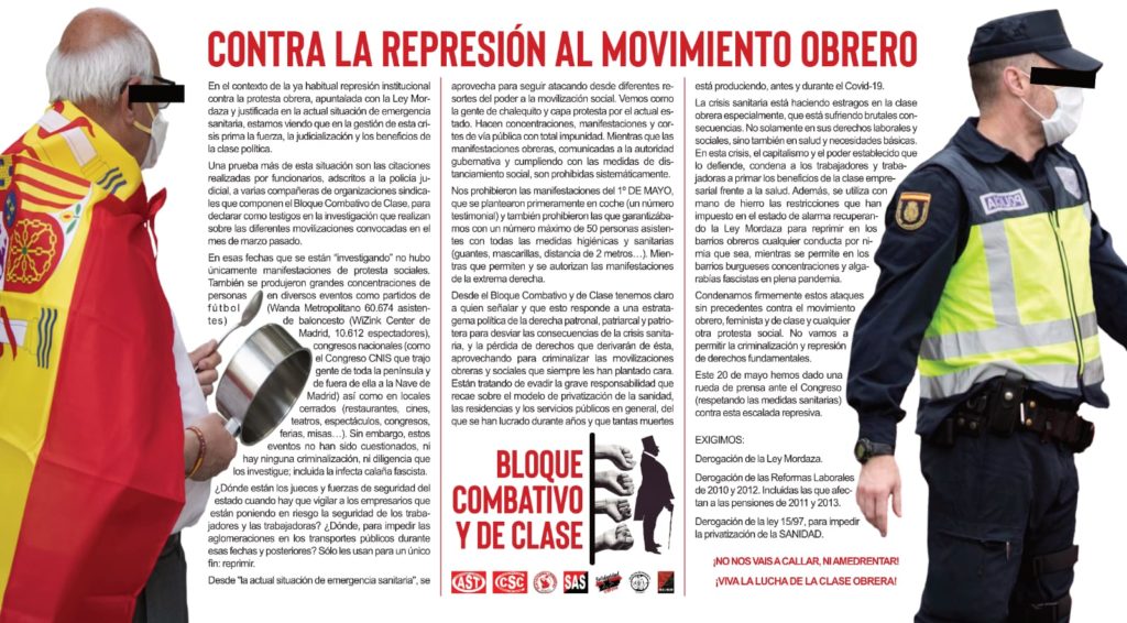 Un prueba más de esta situación son las citaciones realizadas por funcionarios, adscritos a la policía judicial, a varias compañeras de organizaciones sindicales que componen el Bloque Combativo de Clase, para declarar como testigos en la investigación que realizan sobre las diferentes movilizaciones convocadas en el mes de marzo pasado.