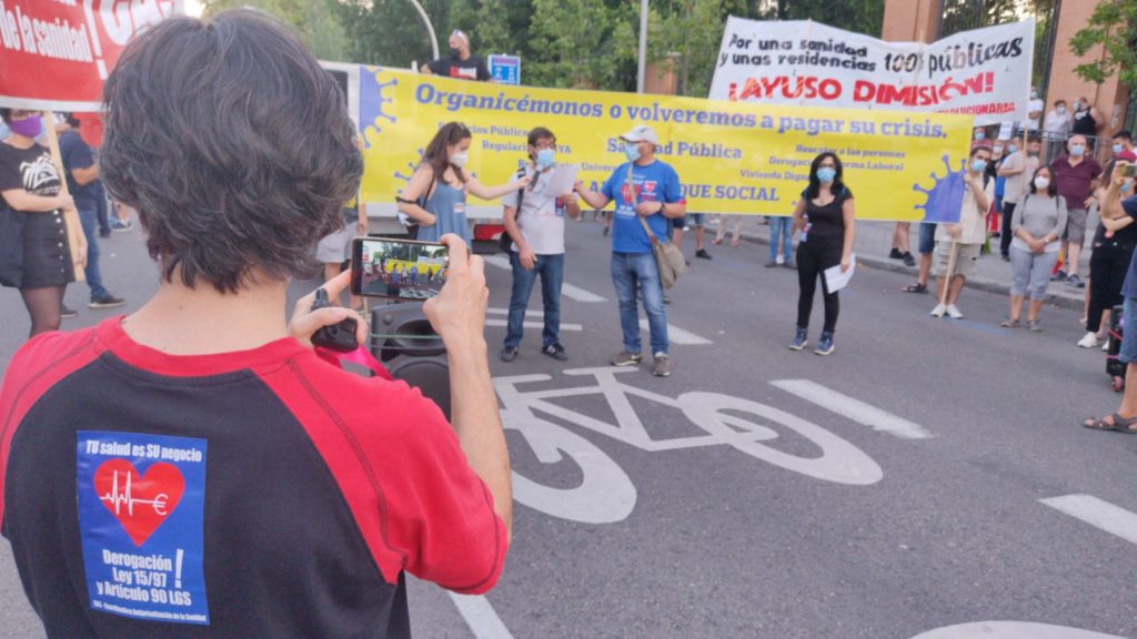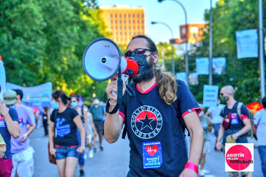 Y a pesar del miedo, del silencio mediático y de la manipulación informativa muchos miles de personas, con sus mascarillas, con su distancia de seguridad, de todas las edades – aunque por primera vez predominaba la juventud, las calles de Madrid (esta vez los “barrios altos”), se han inundado de pueblo. Del pueblo diverso, en el que destacaba una nutrida representación de jóvenes “sin papeles” – aplaudidos a rabiar -, de mucha gente que venida de los pueblos, se tragaba el miedo y se subía por primera vez a un transporte público, la gente del Metro y de la EMT con un papel destacado en toda la logística de la manifestación, los “riders”, currantes de todo tipo, de pensionistas, y – cómo no – muchos trabajadores y trabajadoras de la sanidad.