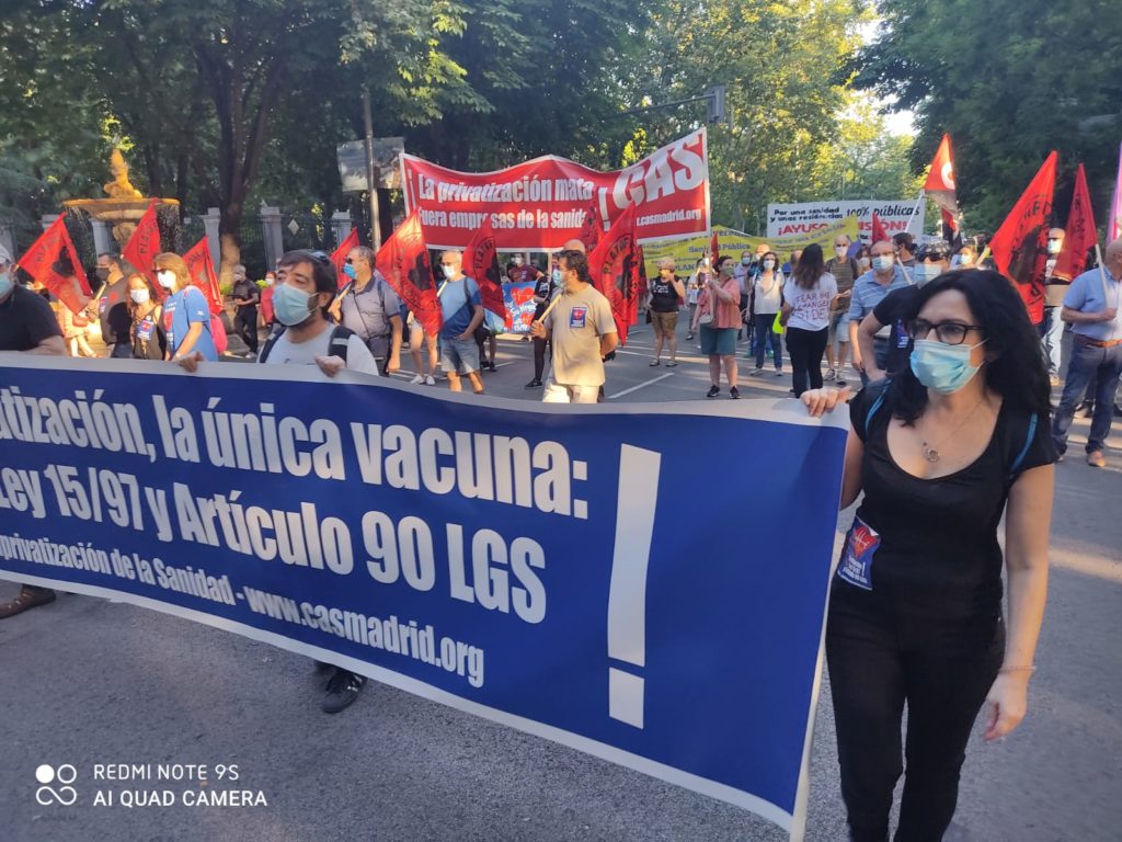 Más de cinco mil manifestantes, con mascarilla y guardando la distancia de seguridad sanitaria recogieron ayer, 20 de junio, las calles del centro de Madrid, desde Atocha al Hospital Infantil Niño Jesús, en defensa de la sanidad pública y contra las privatizaciones. La convocatoria unitaria fue alentada por CAS, la Coordinadora Antiprivatización de la Sanidad que lleva luchando desde 2004 y preparando esta etapa de movilizaciones desde el inicio de la pandemia. A la convocatoria se unieron la Plataforma de Centros de Salud de Madrid, el Comité de Huelga de los MIR, el Plan de Choque Social, el Bloque Combativo y de Clase, Asociaciones de Vecinos, la COESPE, la Asoc. Víctimas del franquismo y decenas de organizaciones sindicales, sociales y políticas.