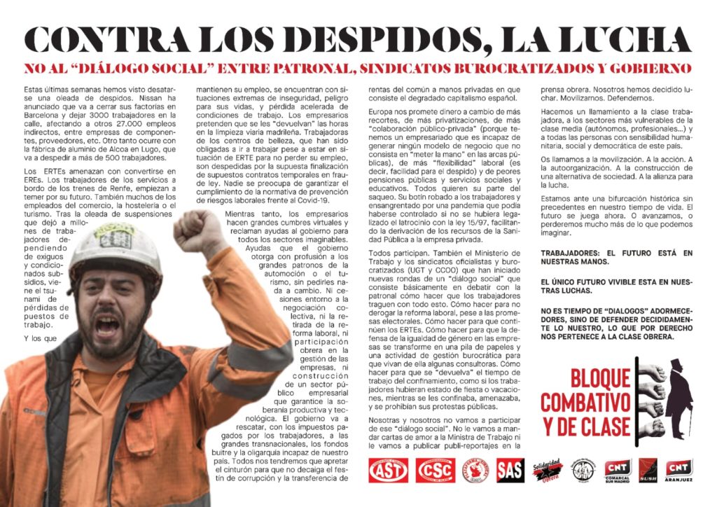 Mientras tanto, los empresarios hacen grandes cumbres virtuales y reclaman ayudas al gobierno para todos los sectores imaginables. Ayudas que el gobierno otorga con profusión a los grandes patronos de la automoción o el turismo, sin pedirles nada a cambio. Ni cesiones entorno a la negociación colectiva, ni la retirada de la reforma laboral, ni participación obrera en la gestión de las empresas, ni construcción de un sector público empresarial que garantice la soberanía productiva y tecnológica. El gobierno va a rescatar, con los impuestos pagados por los trabajadores, a las grandes transnacionales, los fondos buitre y la oligarquía incapaz de nuestro país. Todos nos tendremos que apretar el cinturón para que no decaiga el festín de corrupción y la transferencia de rentas del común a manos privadas en que consiste el degradado capitalismo español.