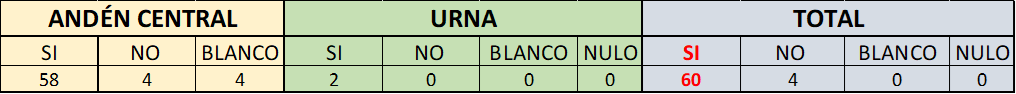 En la votación realizada el lunes 26 de septiembre, con un censo de 80 votaron 68 con el siguiente resultado: