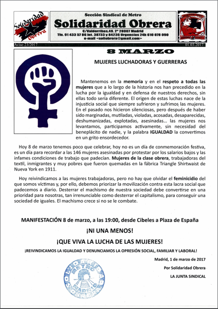 Hoy reivindicamos a las mujeres trabajadoras, pero no hay que olvidar el feminicidio del que somos víctimas y, por ello, debemos priorizar la movilización contra esta lacra social que padecemos a diario. Desterrar el machismo de nuestra sociedad debe convertirse en una prioridad para nosotras, tan irrenunciable como desterrar el capitalismo, para conseguir una sociedad de iguales. El machismo crece si no se le combate.
