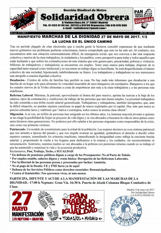 PARTICIPA, DIFUNTE Y ACUDE A LA MANIFESTACIÓN DE LAS MARCHAS DE LA DIGNIDAD.- 17:00 h Neptuno- Gran Vía. 16:30 h. Puerta de Alcalá Columna Bloque Combativo de Clase.