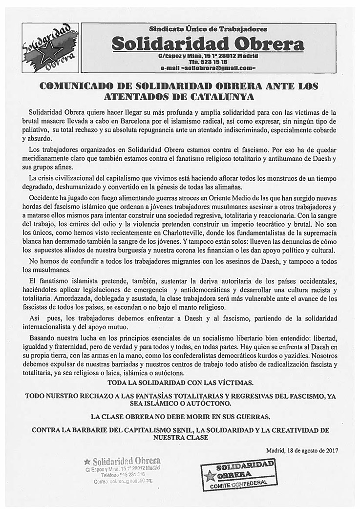 Solidaridad Obrera quiere hacer llegar su más profunda y amplia solidaridad para con las víctimas de la brutal masacre llevada a cabo en Barcelona por el islamismo radical, así como expresar, sin ningún tipo de paliativo, su total rechazo y su absoluta repugnancia ante un atentado indiscriminado, especialmente cobarde y absurdo.