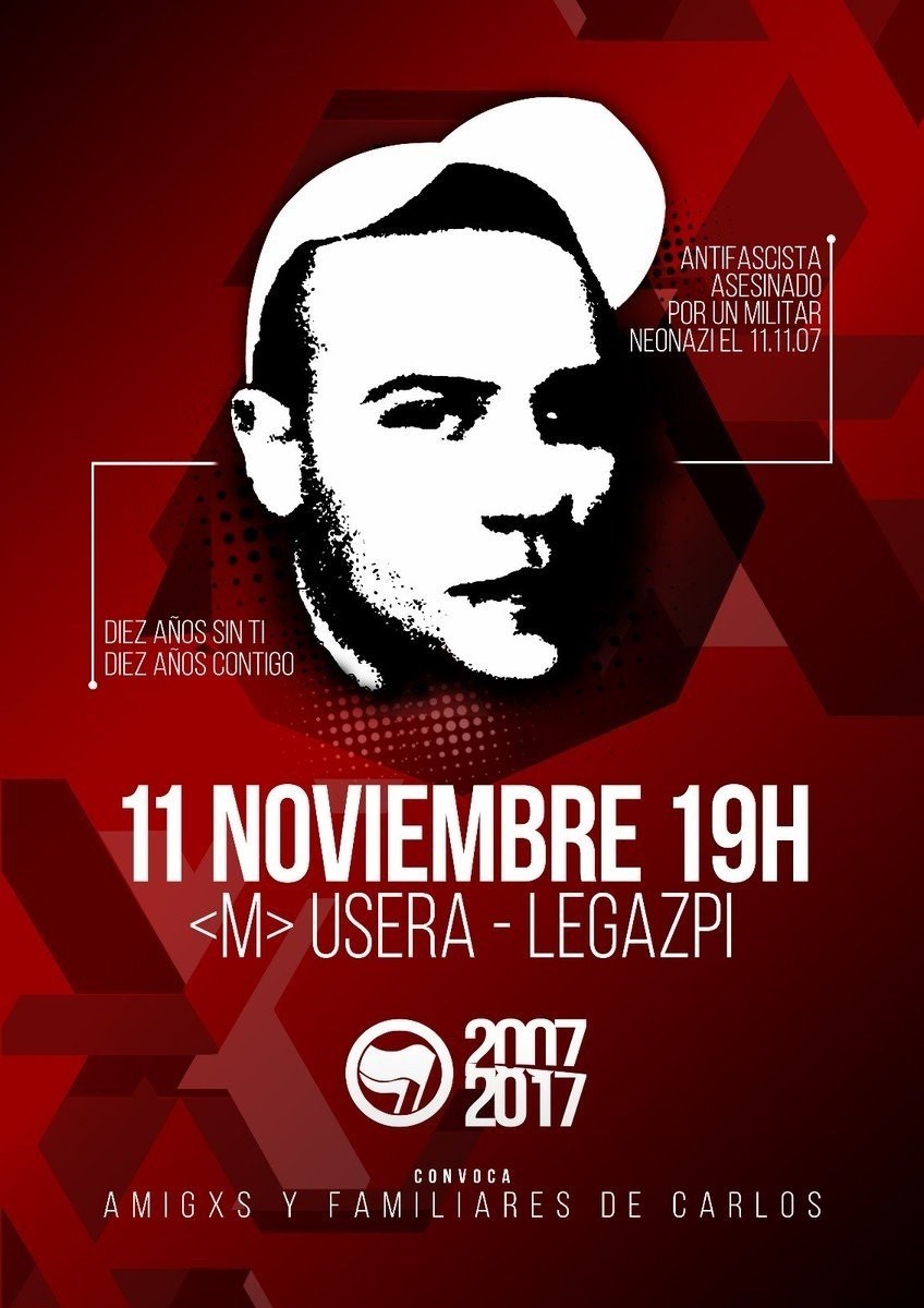 #11NOV El sábado próximo 11 de noviembre estamos convocados a la MANIFESTACIÓN que partirá del Metro Usera a las 19:00 h hasta Legazpi con motivo del décimo aniversario del asesinato del joven de 16 años Carlos Palomino por un militar fascista que le asestó una puñalada en el corazón.