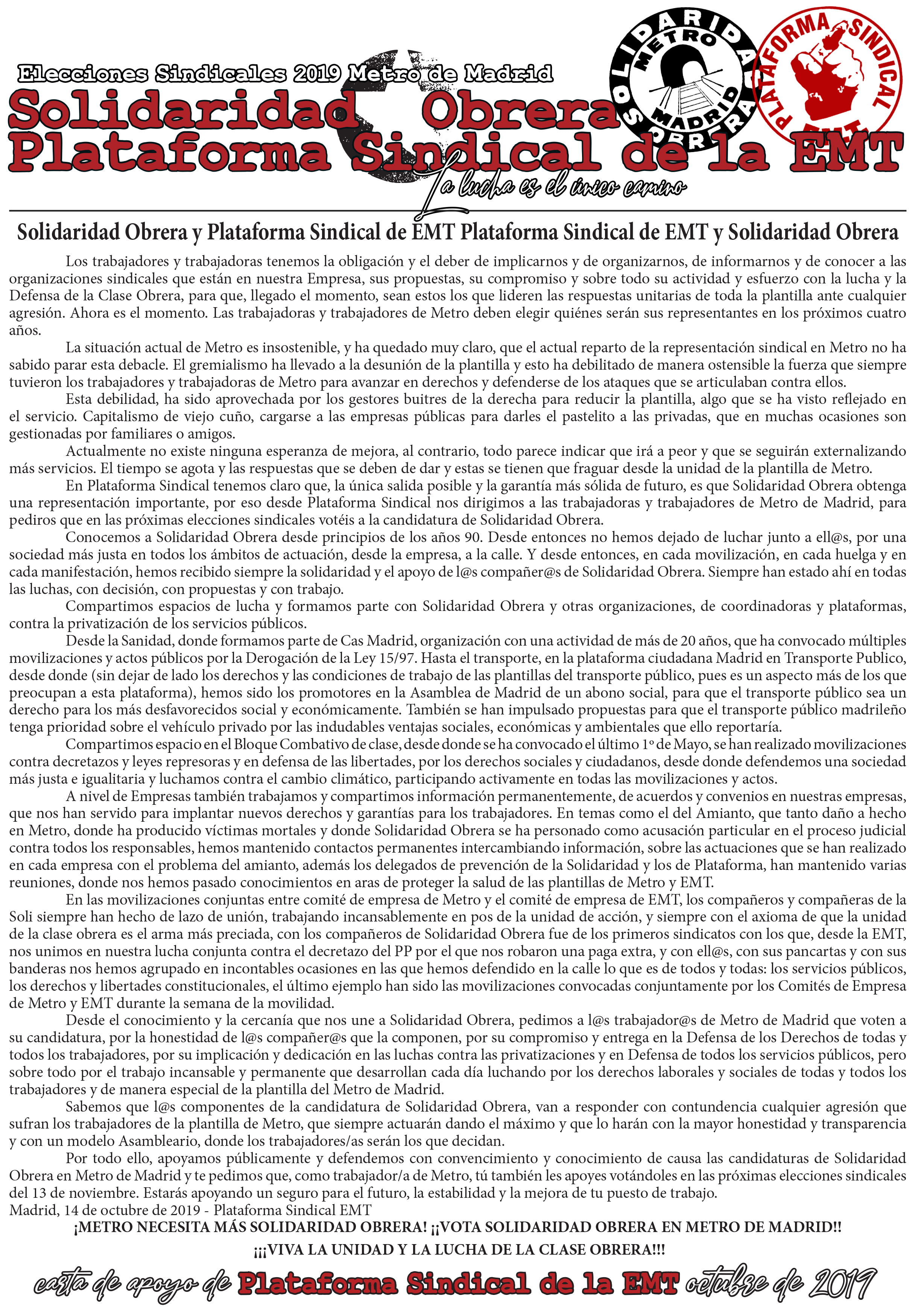 Por todo ello, apoyamos públicamente y defendemos con convencimiento y conocimiento de causa las candidaturas de Solidaridad Obrera en Metro de Madrid y te pedimos que, como trabajador/a de Metro, tú también les apoyes votándoles en las próximas elecciones sindicales del 13 de noviembre. Estarás apoyando un seguro para el futuro, la estabilidad y la mejora de tu puesto de trabajo.