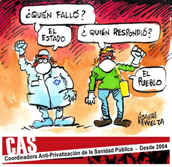 Y en muchos hospitales y centros de salud, ante la parálisis de la administración sanitaria, los trabajadorxs se organizaron al margen de las direcciones sin esperar directrices, para aplicar medidas de contención en los centros de salud, para coordinar las camas disponibles entre hospitales, para intercambiarse información……en jornadas laborales muchas veces infinitas.