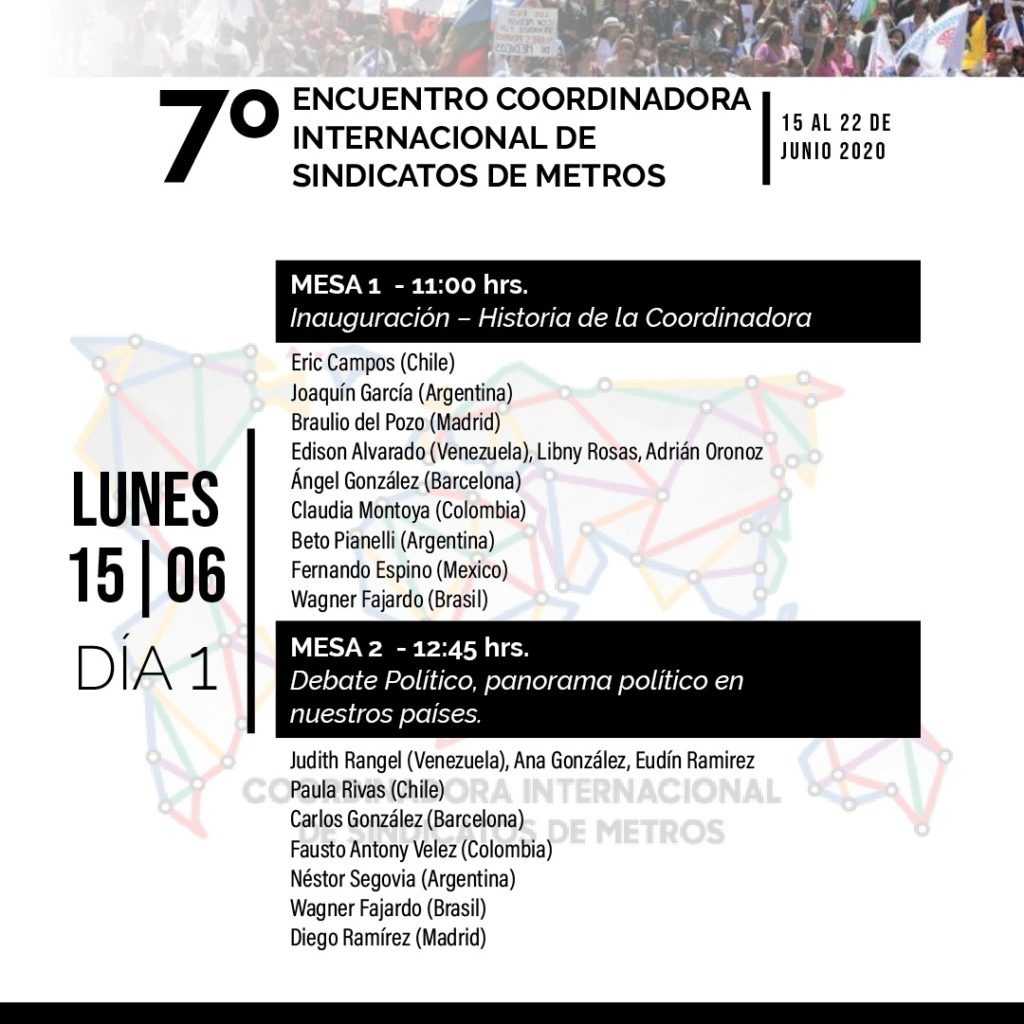 Ha comenzado el VII Encuentro Internacional de la Coordinadora Internacional de Sindicatos de Metros, en el que participa Solidaridad Obrera, se puede asistir en vivo a través de Facebook Live, el encuentro comienza hoy 15 de junio de 2020, hasta el próximo viernes 18, desde las 16:00 horas de inicio en nuestro huso horario: