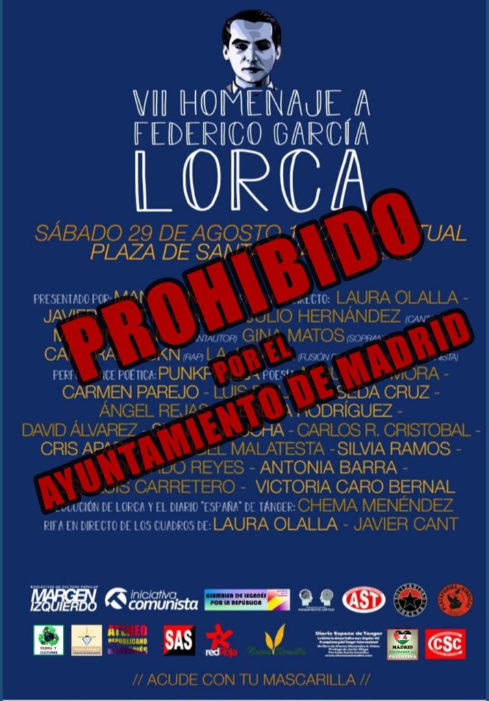 El sábado 29 de agosto, como en años anteriores, diversos organismos sindicales, políticos y culturales de la clase trabajadora de Madrid, entre ellos Solidaridad Obrera, íbamos a realizar en la Plaza de Santa Ana un acto de homenaje al poeta asesinado por el fascismo, al bardo de la República, al hacedor de sueños del pueblo, llamado Federico García Lorca. El año anterior, numerosas personas declamaron versos, inventaron músicas, compartieron su arte, en un cálido homenaje a Lorca en el corazón del Madrid de las Letras.