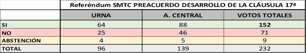 RESULTADO REFERÉMDUM DEL DÍA 03/11/22 DE TALLERES CENTRALES CLÁUSULA 17ª: