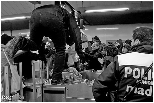 En la capital, en la primera acción, los participantes se citaron en la estación de Sol a las 5 de la tarde. La idea era saltar los tornos y entrar dentro del andén para protestar de forma simbólica. Sin embargo, los activistas no pudieron acceder en esta estación porque un fuerte dispositivo de la unidad antidisturbios impedía el paso. En ese momento han decidido dirigirse hacia la cercana estación de Callao.