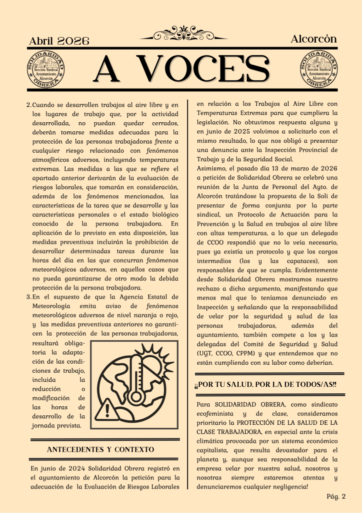 Asimismo, el pasado día 13 de marzo de 2026 a petición de Solidaridad Obrera se celebró una reunión de la Junta de Personal del Ayto. de Alcorcón tratándose la propuesta de la Soli de presentar de forma conjunta por la parte sindical, un Protocolo de Actuación para la Prevención y la Salud en trabajos al aire libre con altas temperaturas, a lo que un delegado de CCOO respondió que no lo veía necesario, pues ya existía un protocolo y que los cargos intermedios (los y las capataces), son responsables de que se cumpla. Evidentemente desde Solidaridad Obrera mostramos nuestro rechazo a dicho argumento, manifestando que menos mal que lo teníamos denunciado en Inspección y señalando que la responsabilidad de velar por la seguridad y salud de las personas trabajadoras, además del ayuntamiento, también compete a los y las delegadas del Comité de Seguridad y Salud (UGT, CCOO, CPPM) y que entendemos que no están cumpliendo con su labor como deberían.